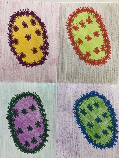 After sketching plant adaptations present in the garden, including spines, showy flowers and waxy coatings, each participant created an art piece highlighting one of the adaptations they had illustrated – but they had to roll a dice and create the art piece in the style of a famous artist. Can you identify the styles of the artists represented below?